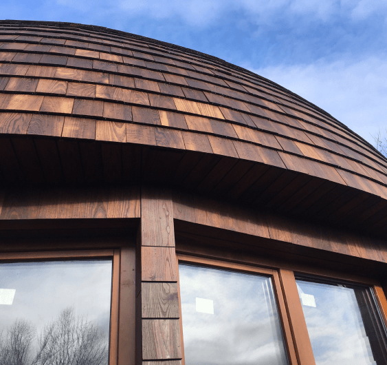 Строительство под ключ дело индивидуальное, но наша практика показывает, что в 80% случаях заказчики используют на внешнюю отделку купола гибкую черепицу, в остальных 20% - это либо натуральный гонт из лиственницы, дранка из осины или металлические кассеты. Утеплитель в купольных домах чаще всего используют минеральную вату и пенополиуретан.